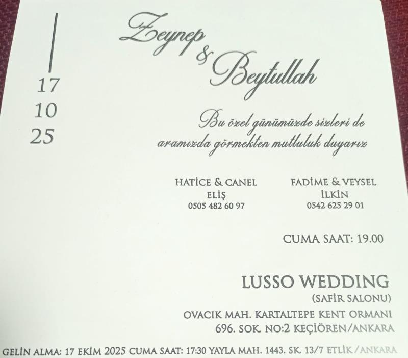 Ankara’da yaşayan köylümüz dernek üyemiz Sancaktepe Camii Dernek Başkanı Veysel İLKİN oğlu Beytullah İLKİN’i evlendiriyor. 17 Ekim Cuma Günü saat 19.00’da Keçiören Ovacık Mahallesinde bulunan LUSSO VEDDİNG Düğün Salonunda (Safir Salon) gerçekleşecek düğün merasimine konu komşu tüm köylülerimiz davetlidir.